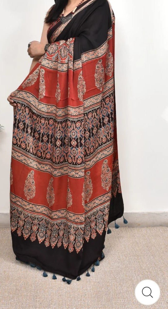 Ajrakh Digital Print Premium Gaji Silk fabric Saree With very soft in texture.. Light weight Silk Fabric with a rich glaze .
