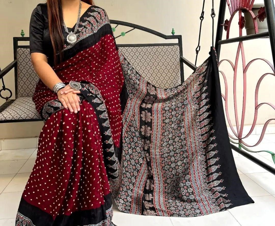 Maroon Ajrakh Digital Print Muslin fabric Saree – Traditional Ethnic Wear for Women