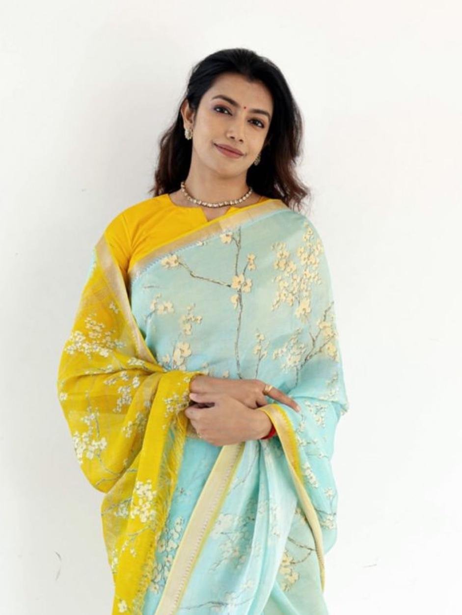 SKY BLUE YELLOW LINEN WITH GOLD JARI BORDER