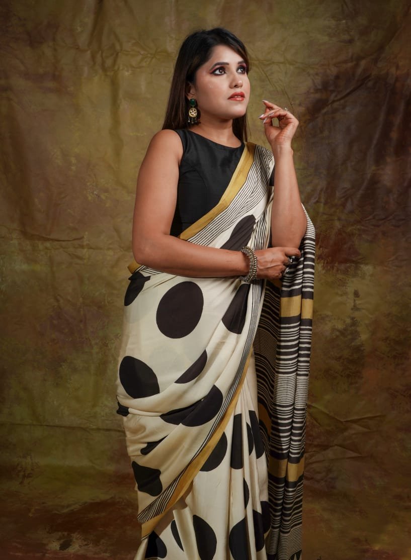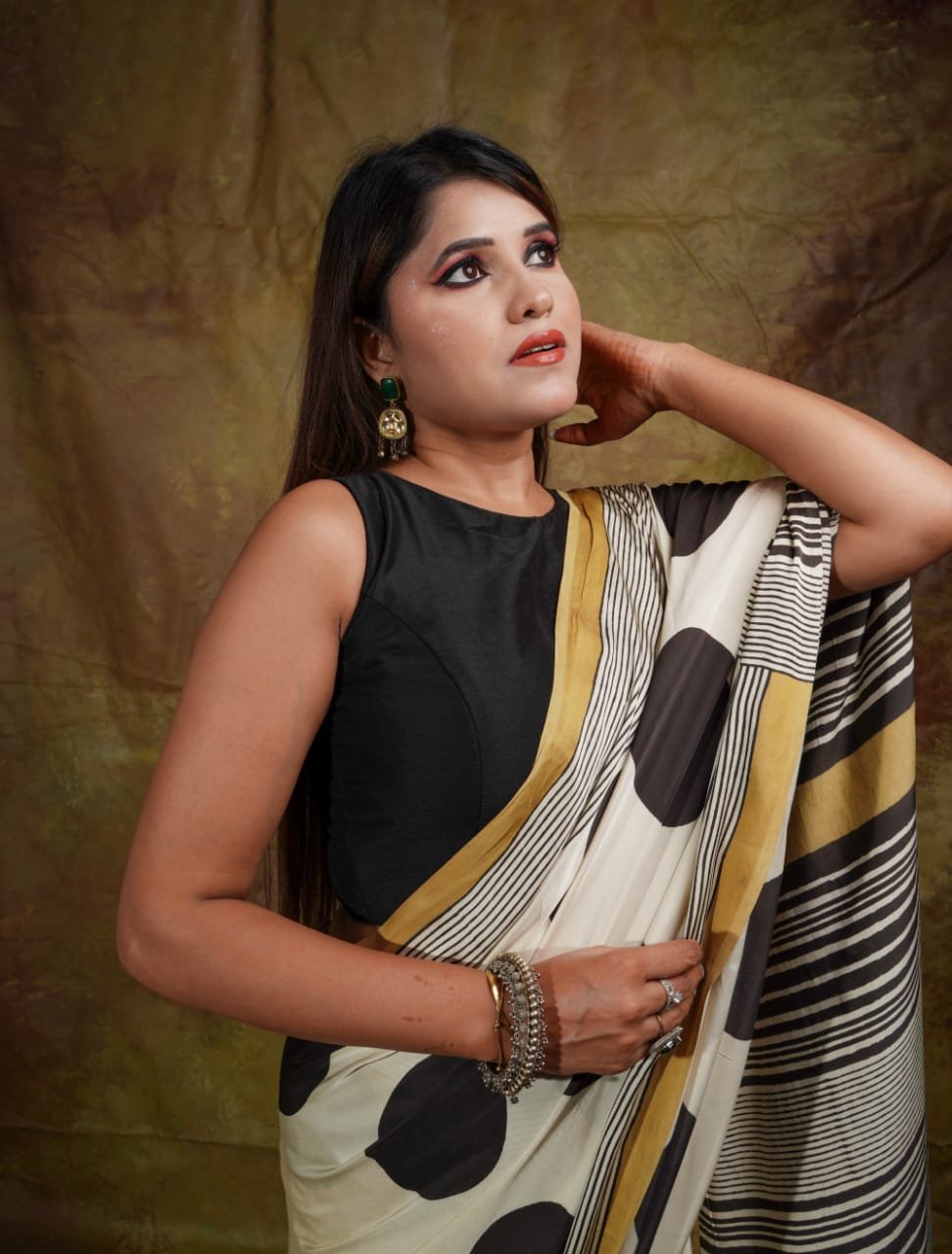 A1: This saree is made from premium fabric, known for its soft texture and breathable comfort.